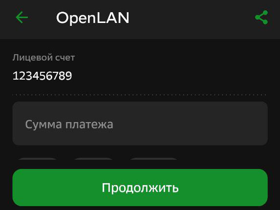 Впишите в строку поиска openlan (маленькими английскими буквами). Внизу появится надпись "Оплатить" и под ней OpenLAN Телекоммуникации. Выбираем ее.