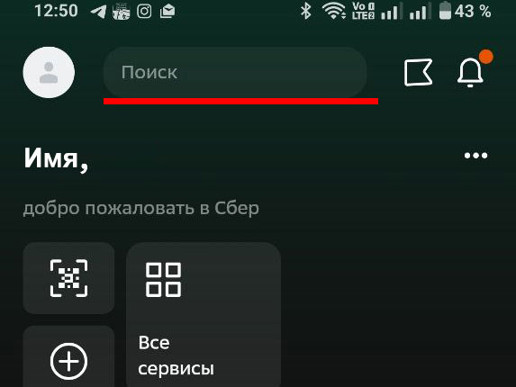 Откройте мобильной приложение Сбербанк Онлайн и нажмите на строку«Поиск».