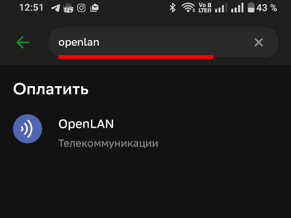 Впишите в строку поиска openlan (маленькими английскими буквами). Внизу появится надпись "Оплатить" и под ней OpenLAN Телекоммуникации. Выбираем ее.
