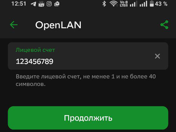 Введите свой Лицевой счет (ПИН) (9 цифр подряд), после чего нажмите "Продолжить".