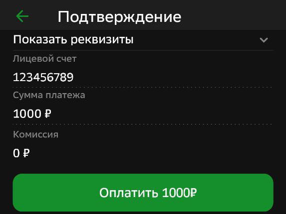Проверьте правильность ввода. Нажав показать реквизиты будет указано юр.лицо . Если все верно нажмите "Оплатить".